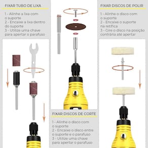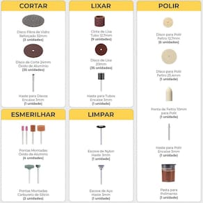 Itens Inclusos: - 3 Discos de Corte 32mm Reforçados - 35 Discos De Corte 24mm - 35 Discos De Lixa 20mm - 9 Tubos De Lixa 12,7mm - 1 Disco de Polimento 25,4mm - 6 Discos de Polimento 12,7mm - 1 Ponta de Feltro 10mm - 1 Ponta Montada 10mm Carboneto de Silício verde - 1 Ponta Montada 20mm Carboneto de Silício verde - 1 Ponta Montada 9,5mm Óxido de Alumínio laranja - 1 Ponta Montada 14,3mm Óxido de Alumínio laranja - 1 Ponta Montada 6mm Óxido de Alumínio rosa - 1 Ponta Montada 6mm Arredondada Óxido de Alumínio rosa - 1 Escova Copo 12mm Aço - 1 Escova 20mm Nylon - 1 Suporte para Tubo de Lixa 12,7mm - 1 Suporte para Discos de Corte e Lixa - 1 Suporte para Disco de Feltro - 1 Pasta de Polimento - 1 Pedra para Afiar - 2 Potes Plásticos Marca: Dremax