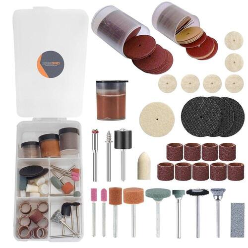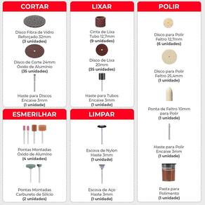 Itens Inclusos: - 3 Discos de Corte 32mm Reforçados - 35 Discos De Corte 24mm - 35 Discos De Lixa 20mm - 9 Tubos De Lixa 12,7mm - 1 Disco de Polimento 25,4mm - 6 Discos de Polimento 12,7mm - 1 Ponta de Feltro 10mm - 1 Ponta Montada 10mm Carboneto de Silício verde - 1 Ponta Montada 20mm Carboneto de Silício verde - 1 Ponta Montada 9,5mm Óxido de Alumínio laranja - 1 Ponta Montada 14,3mm Óxido de Alumínio laranja - 1 Ponta Montada 6mm Óxido de Alumínio rosa - 1 Ponta Montada 6mm Arredondada Óxido de Alumínio rosa - 1 Escova Copo 12mm Aço - 1 Escova 20mm Nylon - 1 Suporte para Tubo de Lixa 12,7mm - 1 Suporte para Discos de Corte e Lixa - 1 Suporte para Disco de Feltro - 1 Pasta de Polimento - 1 Pedra para Afiar - 2 Potes Plásticos - 1 Organizador com 5 divisórias Marca: Dremax