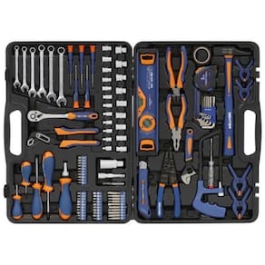 As ferramentas deste jogo da marca dexter são de aço cromo-vanádio com acabamento emborrachado na cor azul e laranja. Contém 108 peças e vem em uma maleta de plástico com fecho que mede 35,8cm de altura, 50,8cm de largura e 7,4 cm de profundidade e pesa 6,076kg.