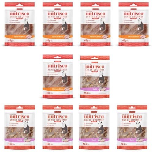 Kit contém: 5un snack gourmet nutrisco 45g chicken bites gato; 5un snack gourmet nutrisco 45g sushi gatos.