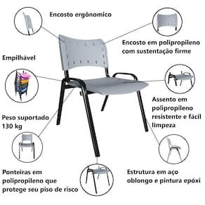Estrutura em aço com pintura epóxi eletrostática na cor preta, assento e encosto fabricados com polipropileno de alta resistência garantindo qualidade e durabilidade do produto, permitindo ser utilizada em área externa.
