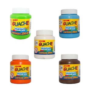 Especificações: - Aplicações: Para pintura em papel, papel cartão, cartolina, EVA, gesso, cerâmica; - Cores miscíveis entre si; - Solúvel em Água; - Produto não indicado para uso na pele; - Composição: Resina, água, pigmentos, carga e conservante; - Conteúdo da embalagem: 11 Potes de 250 ml; - Produto atóxico.