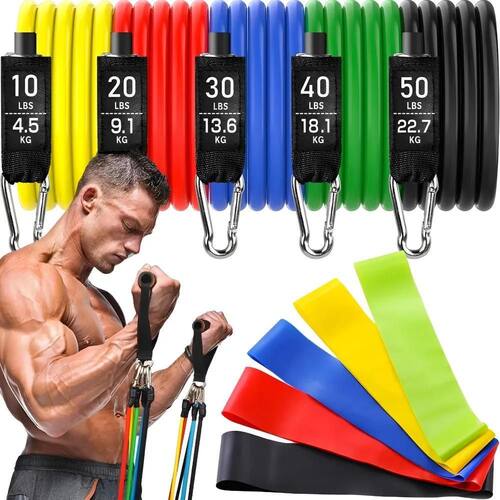 Este kit é composto por 11 extensores elásticos e 5 mini bands, perfeito para um treino completo.