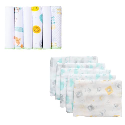 5 fraldas de pano 60x60 cm Caricia Baby estampadas 6 paninhos de boca 30x30 cm 3 estampados e 3 lisos Principais Caracteristicas
