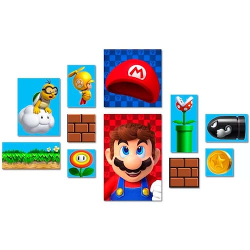 Kit 11 Placas Decorativas Mario O Kit 11 Placas Decorativas Mario da Planeta Decor são uma ótima alternativa para deixar seu ambiente mais bonito. Fáceis de aplicar e são uma ótima solução para quem busca decorar gastando pouco. Podendo compor os ambientes juntas ou separadamente, com diferentes montagens e temas. Especificações: Marca: Planeta Decor. Impressão: Alta Definição. Material: MDF 3mm Cortadas à Laser. Medidas: 4 quadros: 14,5 cm x 14,5 cm 2 quadros: 14,5 cm x 22 cm 2 quadros: 30 cm x 14 cm 1 quadro: 22 cm x 30 cm 1 quadro: 30 cm x 30 cm 1 quadro: 30 cm x 45 cm Itens inclusos: 11 Placas Decorativas. Marca: Não Informado
