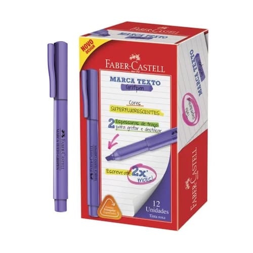 O Marca Texto Grifpen da Faber-Castell possui a ponta chanfrada, que possibilita traços finos e grossos a depender da posição que a ponta é colocada no papel. Seu formato triangular garante maior conforto ao escrever e as cores são superfluorescentes.