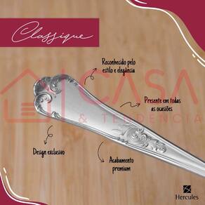 A linha de talheres Classic Hercules é tradicional, com design exclusivo e produzida em aço inox 18/10. Seu acabamento premium, com maior ergonomia e conforto, traz sofisticação para a sua mesa. Os detalhes em alto relevo trazem um toque de luxo para momentos especiais.