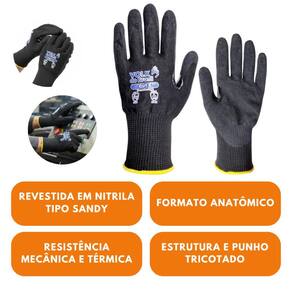Luva de segurança confeccionada em fios de HPPE e basalto, revestida em nitrila tipo sandy na palma e dedos, punho com inserção de fibras elásticas e acabamento em fibras sintéticas. Proteção das mãos contra agentes mecânicos e térmicos.