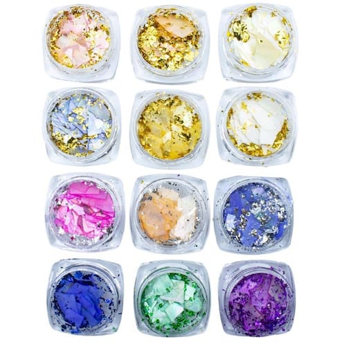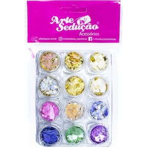 Kit 12 Madrepérola Encapsulamento Unhas de Gel, Arte Sedução Contém: 1 pacote de 12 potinhos com Madréperolas e folhas prateadas, douradas e coloridas para decoração de unhas, Arte Sedução.