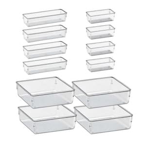 O Que Está Incluso: 12 cestos organizadores de acrílico cristal em tamanhos variados