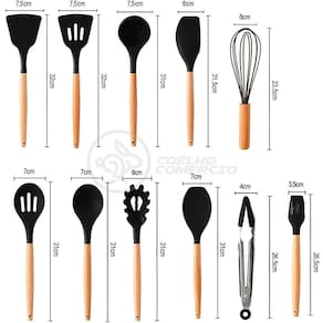 Nosso kit é composto por 12 utensílios essenciais para qualquer cozinha: espátula perfurada, concha, pegador de espaguete, colher perfurada, espátula para wok, espátula de colher, colher sólida, espátula pontuda, pinças, batedor e pincel de confeiteiro. Cada utensílio é feito de silicone premium, seguro para superfícies antiaderentes e com cabos de madeira ergonômicos que proporcionam conforto durante o uso. Além disso, o kit inclui um pote elegante para armazenar todos os utensílios, mantendo sua cozinha organizada e estilosa.