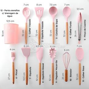 Nosso kit é composto por 12 utensílios essenciais para qualquer cozinha: espátula perfurada, concha, pegador de espaguete, colher perfurada, espátula para wok, espátula de colher, colher sólida, espátula pontuda, pinças, batedor e pincel de confeiteiro. Cada utensílio é feito de silicone premium, para superfícies antiaderentes e com cabos de madeira ergonômicos que proporcionam conforto durante o uso. Além disso, o kit inclui um pote elegante para armazenar todos os utensílios, mantendo sua cozinha organizada e estilosa.