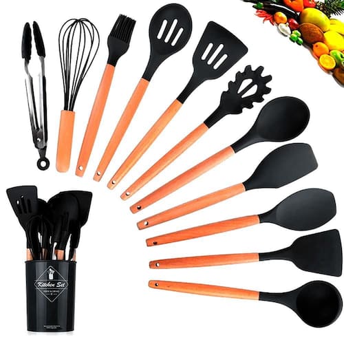 Kit 12 peças utensílios silicone preto concha em madeira Traga estilo e funcionalidade para sua cozinha Nosso kit em silicone possui todos os utensílios que você pode precisar ao realizar seus preparos na cozinha. Kit composto de peças sofisticadas de fácil operação, de segurança e confiabilidade. Você nunca mais vai precisar de outro kit de utensílios. Facilidade de uso: os punhos ergonomicamente projetados e as cabeças perfeitamente moldadas. Projetado para durabilidade e fácil de limpar: o silicone antiaderente premium é literalmente o material mais fácil de limpar, basta utilizar água quente ou apenas água e detergente. Silicone higiênico da mais alta qualidade: silicone 100% livre de bpa; eco-amigável; resistente ao calor até 230 c; resistente a mancha e odor. Acabamento de madeira, aperto macio, não há nenhuma preocupação com uma espátula escorregando para fora de sua mão, mesmo se suas mãos estão molhadas. Cada um dos utensílios que compõem o conjunto tem um orifício na alça para pendurar corretamente quando não estiver em uso. O material é de alta qualidade com cabo em madeira e silicone resistente a altas temperaturas, diferente dos utensílios de plástico encontrados em lojas gerais, que derretem facilmente.