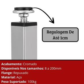 CARACTERÍSTICAS DO PRODUTO: Regulagem ajustável: até +1cm, garantindo nivelamento em qualquer superfície. Material: Metal de alta resistência e durabilidade. Design: Moderno, quadrado e cromado, ideal para diversos estilos de decoração. Fixação segura: 4 parafusos por pé para máxima estabilidade. Capacidade de carga: Suporta até 100kg por pé.