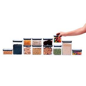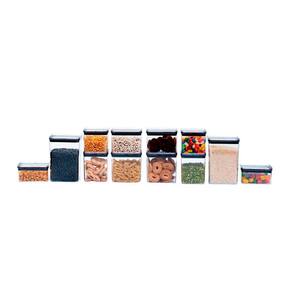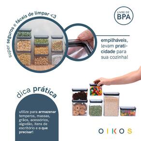 "conheça o kit de 12 potes de acrílico com tampa quadrada empilháveis transparentes de 480ml, 620ml, 800ml, 870ml, 1,1L e 1,6L da oikos.