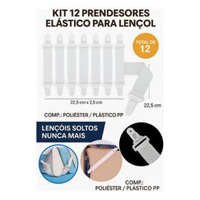 Kit 12 Prendedores Elástico Para Lençol Cama Queen Solteiro Casal Sua cama sempre esticada, como de hotel Chega de lençol saindo do lugar durante a noite Com o Kit 12 Prendedores Elástico Para Lençol, sua cama vai estar sempre impecável, como nos melhores hotéis. Ideal para camas de solteiro, casal, queen e até king, o acessório é compatível com lençóis com ou sem elástico. Benefícios: Mantém o lençol sempre firme e esticado. Evita dobras e amassados. Fácil de colocar e retirar. Compatível com diversos tamanhos de colchão. Pode ser também em capas protetoras e forros. Especificações Técnicas: Produto: Prendedores de Lençol Quantidade no Kit: 12 unidades Material: Elástico de Poliéster + Presilhas em Plástico PP Medidas de cada prendedor: 22,5 cm x 2,5 cm Cor: Branco Indicado para: Solteiro, Casal, Queen, King Modo de usar: Estique o lençol sobre o colchão. Prenda uma presilha em cada canto, esticando bem. Esconda o excesso de tecido sob o colchão. Pronto Lençol firme, cama organizada Ideal para: Casas Hotéis e pousadas Cuidados com idosos Quartos infantis lençol não sai com facilidade Marca: Não Informado