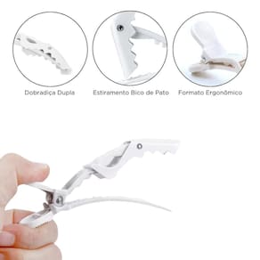 A presilha de cabelo no formato de bico de jacaré é um acessório para prender os cabelos, apresenta um design alongado e estreito, semelhante à mandíbula de um jacaré. Feita de plástico resistente. Seu uso pode ser doméstico ou em salões de beleza por cabeleireiros, para separar mechas para corte, coloração, auxilia também em penteados.