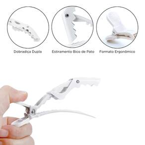 A presilha de cabelo no formato de bico de jacaré é um acessório para prender os cabelos, apresenta um design alongado e estreito, semelhante à mandíbula de um jacaré. Feita de plástico resistente. Seu uso pode ser doméstico ou em salões de beleza por cabeleireiros, para separar mechas para corte, coloração, auxilia também em penteados.