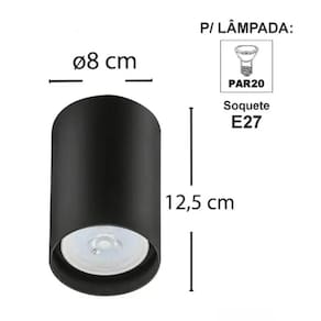 Kit 12 Spots de Sobrepor para Teto 8x12,5cm Preto Bivolt Luminária PAR20 Zoom.