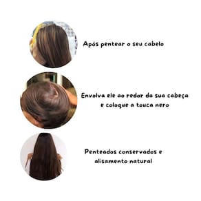 Modo de uso: - 1 Passo: Primeiramente lave os cabelos e deixe-os secar naturalmente. - 2 Passo: Quando estiverem levemente úmidos, divida-os ao meio, escolha uma parte pegando do meio da nuca e gire o cabelo para frente com o auxílio de um pente ou escova, fazendo a volta na sua cabeça. - 3 Passo: Forre toda a cabeça com os cabelos na mesma direção e coloque a touca. Caso seja necessário coloque grampos para segurar os cabelos antes de vestir a touca. - 4 Passo: Permaneça com a touca Nero na cabeça por um tempo e em seguida repita o processo para o lado oposto para não deixar o cabelo marcado.