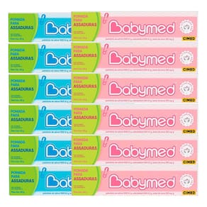 Kit com 12 unidades Babymed (6 Babymed Azul / 6 Babymed Rosa) BABYMED POMADA é ideal para proteger a pele do bebê contra assaduras. Indicada para prevenir assaduras, formando uma camada protetora na pele do bebê que a mantém longe do cocô e do xixi. Deixa a pele do bebê sempre hidratada e bem nutrida, pois possui em sua formulação as Vitaminas A e E. Fácil de usar, espalhar, limpar e remover. Pomada dermatológica de uso tópico, externo e pediátrico.
