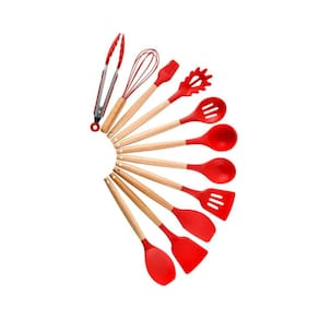 Kit 12 Utensílios de Cozinha em Silicone Cabo de Madeira Resistente ao Calor - Vermelho