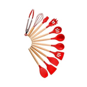 Kit 12 Utensílios De Cozinha Em Silicone E Cabo De Madeira Resistente Ao Calor Vermelho