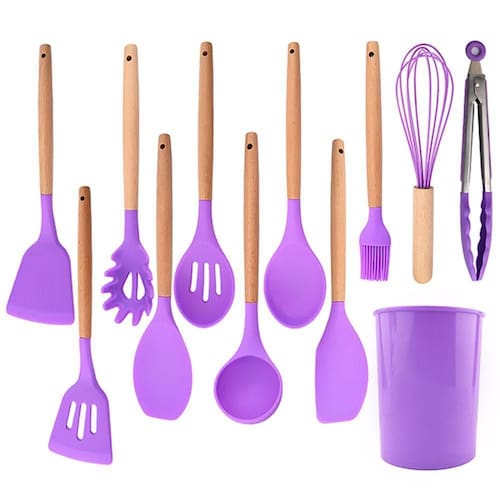 Nosso kit é composto por 12 utensílios essenciais para qualquer cozinha: espátula perfurada, concha, pegador de espaguete, colher perfurada, espátula para wok, espátula de colher, colher sólida, espátula pontuda, pinças, batedor e pincel de confeiteiro. Cada utensílio é feito de silicone premium, seguro para superfícies antiaderentes e com cabos de madeira ergonômicos que proporcionam conforto durante o uso. Além disso, o kit inclui um pote elegante para armazenar todos os utensílios, mantendo sua cozinha organizada e estilosa.