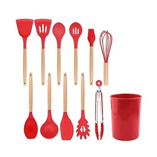 Nosso kit é composto por 12 utensílios essenciais para qualquer cozinha: espátula perfurada, concha, pegador de espaguete, colher perfurada, espátula para wok, espátula de colher, colher sólida, espátula pontuda, pinças, batedor e pincel de confeiteiro. Cada utensílio é feito de silicone premium, seguro para superfícies antiaderentes e com cabos de madeira ergonômicos que proporcionam conforto durante o uso. Além disso, o kit inclui um pote elegante para armazenar todos os utensílios, mantendo sua cozinha organizada e estilosa.