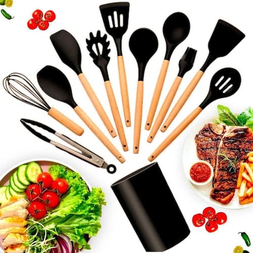 Kit 12 Utensílios Talheres De Cozinha Silicone Cabo Madeira