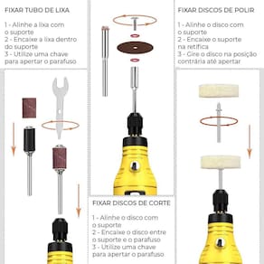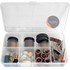 itens Inclusos: - 1 Organizador com 7 divisórias - 1 Pinça 3mm - 1 Pinça 2.4mm - Disco Flap Grão 80 Haste 3mm - 10 Discos de Corte 32mm reforçados - 35 Discos De Corte 24mm - 35 Discos De Lixa 20mm - 1 Suporte para Discos de Corte e Lixa Haste 3mm - 9 Tubos De Lixa 12,7mm Grão 120 - 1 Suporte para Tubo de Lixa 12,7mm Haste 3mm - 2 Tubos de Lixa 8mm Grão 80 - 2 Tubos de Lixa 8mm Grão 120 - 2 Tubos de Lixa 8mm Grão 180 - 1 Suporte para Tubos de Lixa 8mm Haste 2.4mm - 1 Ponta Diamantada Cilíndrica 6mm Haste 2.4mm - 1 Ponta Diamantada Cilíndrica 5mm Haste 2.4mm - 1 Ponta Diamantada Cônica 4mm Haste 2.4mm - 1 Ponta Diamantada Oval 4mm Haste 2.4mm - 1 Ponta Diamantada Cônica Ponta Fina 3mm Haste 2.4mm - 1 Disco de Polimento 25,4mm - 6 Discos de Polimento 12,7mm - 1 Ponta de Feltro 10mm Haste 3mm - 1 Suporte para Disco e Ponta de Feltro Haste 3mm - 1 Ponta Montada 10mm Carboneto de Silício verde Haste 3mm - 1 Ponta Montada 20mm Carboneto de Silício verde Haste 3mm - 1 Ponta Montada 9,5mm Óxido de Alumínio laranja Haste 3mm - 1 Ponta Montada 14,3mm Óxido de Alumínio laranja Haste 3mm - 1 Ponta Montada 6mm Óxido de Alumínio rosa Haste 3mm - 1 Ponta Montada 6mm Arredondada Óxido de Alumínio rosa Haste 3mm - 1 Escova Copo 12mm Aço Haste 3mm - 1 Escova Circular 20mm Nylon Haste 3mm - 1 Pasta de Polimento - 1 Pedra para Afiar - 2 Potes Plásticos Marca: Dremax