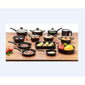 O conjunto de panelas mais completo com a qualidade que sua família merece e com o preço justo que seu bolso mereceAs panelas são em alumínio com revestimento antiaderente que além de facilitar a preparação de alimentos com maior rapidez e facilidade, torna a hora de lavar a louça uma tarefa mais simples.Os cabos, alças e pegadores da tampa são anatômicos em baquelite antitérmico, proporcionando maior segurança e durabilidade com elegância e modernidade para a sua cozinha Ideal para cozinhar no dia a dia, proporciona qualidade e conforto.Material: TeflonAntiaderente: SimEspessura Material: 1,5mmCor: Preto ou VermelhoEmbalagem: Branca ou Parda01 - Panela de 14cm de diâmetro01 - Panela de 16cm de diâmetro01 - Panela de 18cm de diâmetro01 - Panela de 20cm de diâmetro01 - Caçarola de 16 cm de diâmetro01 - Caçarola de 20 cm de diâmetro01 - Fervedor de 14 cm de diâmetro01 - Frigideira de 16 cm de diâmetro01 - Frigideira de 18 cm de diâmetro01 - Frigideira de 20 cm de diâmetro01 - Forma de Bolo 25 cm de diâmetro01 - Forma de Bolo 30 cm de diâmetro01 - Assadeira retangular 30 cm de diâmetro01 - Panela de Pressão 2,5 litrosTodos os nossos produtos são devidamente embalados com plástico bolha e caixa de papelão.