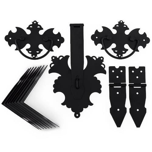Kit 14 Peças Para Baú Alça Dobradiças Fecho Medalhão Preto 2 Puxadores Alça 1 Medalhão + Fecho 8 Cantoneira 2 Dobradiça Total 14 peças. Acompanha Parafusos na cor preta. Medidas : Dobradicas 14 cm x 4 cm tamanho total aberto Puxador alça 14cm x 9 cm Cantoneiras 10 cm x 2,5 cm cada canto Medalhão com o fecho 14 cm x 26 cm tamanho total medalhão + o fecho aberto Produto ideal para baú de tamanho médio e grande . , produto direto de fábrica com o melhor preço e qualidade.. Marca: Não Informado Ean: 6012502971928