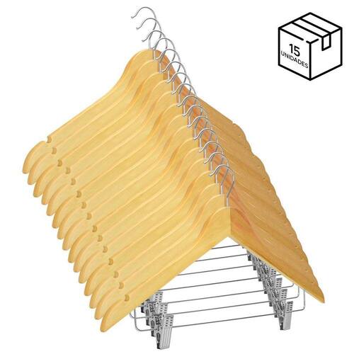 Kit 15 Cabides de Madeira com Presilhas e Gancho de Metal