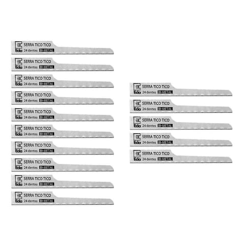 Kit 15 Lâminas para Serra Tico-Tico Pneumática Bimetal 24D EDA- Marca Eda- Referência: 9YL-3X- Kit com 15 Lâminas de serra tico-tico pneumática- Material: Aço Bimetal- Lâmina com 24 dentes- Ideal para corte de metais, fibra de vidro e plásticos- Medidas 9.35 x 12.5 x 0.6 mm- Peso bruto: 25 gramas- Garantia: 90 dias contra defeitos de fabricação