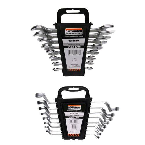 Jogo De Chave Estrela Starfer 8 Peças 6 A 22mm. Utilizados em porcas, parafusos quadrados e sextavados. Acabamento niquelado e cromado. Composto por 8 peças, com medidas:6 e 7 - 8 e 9 -10 e 11 - 12 e 13- 14 e 15 - 16 e 17 - 18 e 19 - 20 e 22mmRef:. 3502589 Jogo de chave fixa com 8 peças.6mm a 22mm com 8 Peças Aço Carbono Cromado. Composição de tamanhos: 6x7, 8x9, 10x11, 12x13, 14x15, 16x17, 18x19, 20x22mm.Ref.: 03502279. Marca.: Starfer