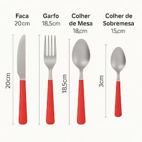 Especificações: Dimensões: Faca: 20cm altura x 1,5cm diâmetro Garfo: 18,5cm altura x 2,5cm diâmetro Colher de Mesa: 18cm altura x 3,5cm diâmetro Colher Sobremesa: 15cm altura x 3cm diâmetro Composição: Aço Inox e Plástico Peso: 376g Cor: Inox com Vermelha
