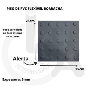 Material PVC Flexível macio e confortável ao pisar. Medidas: 250 x 250 x 5 mm. Aplicação por cola de contato uso interno e externo . Não acompanha cola.