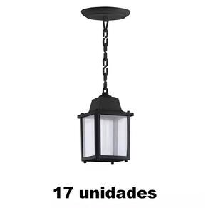 Kit com 17 unidades O pendente colonial em termoplástico é especial para usar em ambientes externos. Como possui proteção UV, ele resiste muito bem as ações do tempo. Uso Externo ou Interno - Cor: preto - Material: termoplástico injetado - Medidas: A 17cm x L 10,5cm x C 10,5cm - Fio: 19 cm - Canopla: Ø 12cm - Proteção UV - Não desbota ou fica quebradiço ao longo do tempo. - Não enferruja - Soquete porcelana: E27 bocal comum - Tensão: 127/220v - BIVOLT - Potência máxima: 20 W - Corrente: 4 A Lâmpada não inclusa