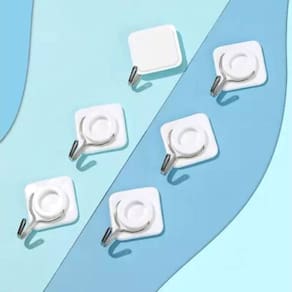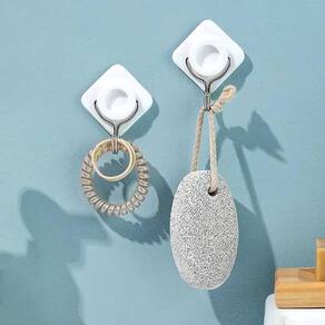 Cada gancho vem acoplado a uma placa adesiva em formato losango, que garante fixação firme e segura em superfícies lisas como azulejos, vidros, portas ou móveis.