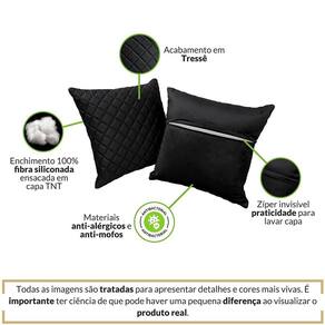 Dimensões do Produto: 01/02: Unidade; Altura: 50 cm; Largura: 50 cm; Profundidade: 18 cm; Peso: 1 Kg;02/02: Unidade; Altura: 40 cm; Largura: 40 cm; Profundidade: 18 cm; Peso: 1 Kg;Características do Produto: Enchimento: Fibra de Poliéster 100% siliconada ensacada em capa de TNT; Zíper: Invisível, permitindo a retirada da capa para limpeza ou substituição; Revestimento: Veludo; Diferenciais: _Anti-alérgico; _Anti-mofo;