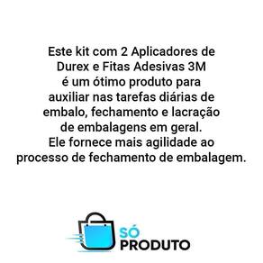 Este kit com 2 aplicador de durex e fitas adesivas 3m é um ótimo produto para auxiliar nas tarefas diárias de embalo, fechamento e lacração de embalagens em geral. Ele fornece mais agilidade ao processo de fechamento de embalagem. O aplicador fita adesiva 3m é uma ferramenta que permite que o usuário não necessite utilizar as duas mãos durante a aplicação da fita adesiva 3m, visto que além de segurar a fita 3m, o aplicador 3m também possui uma área de corte. Fita adesiva não inclusa.CaracterísticasUsar o aplicador de fita adesiva 3m é uma ótima ideia para otimizar e acelerar o trabalho de embalagens e fechamentos de caixas e pacotes. Com o aplicador de fita adesiva 3m é possível empacotar diversas caixas em série com menos cansaço durante a operação e com mais facilidade sendo possível usar fita adesiva 3m ou durex 3m para realizar o trabalho, e ainda por cima o dispensador uso industrial aplicador de fitas 3m ainda é muito simples e prático para realizar a troca de fitas 3m quando necessário.DetalhesFacilita na próxima colagem, mantendo a fita com a ponta sempre fácil.Material: plásticoDiâmetro interno da arruela: 76,2 mmLargura máxima da fita: 50 mmComprimento máximo da fita: 100 mEspecificaçõesBase estrutural fabricada em material plástico reforçado.Cabo anatômico fabricado em plástico reforçado para que não machuque as mãos ao utilizar o produto por um longo períodoHaste plástica para pressionar a fita durante a aplicação.Lâmina serrilhada para corte da fita com tampo protetor.As imagens são meramente ilustrativas