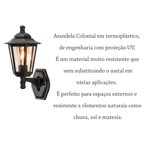 Kit 2 arandela colonial externa preta lente transparente lup42 nós da acende a luz procuramos trazer o que há de mais atual e moderno no mundo da iluminação priorizando sempre a qualidade. Procuramos não apenas atender às suas necessidades, mas superar expectativas. Assim estabelecendo uma relação de confiança nossa missão é garantir a satisfação total dos nossos clientes. Arandela lup42 colonial retro em termoplástico de engenharia com proteção uv, é um material muito resistente que vem substituindo o metal em várias aplicações. É perfeito para espaços externos e resistente a elementos naturais como chuva, sol e maresia. Tem capacidade para uma lâmpada e27. A lente por ser transparente pode ser utilizado lâmpadas bulbo comuns ou lâmpadas de filamento retro. -- neste kit contém 2 arandelas --