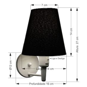 Kit/2 Arandela Cone Md-2013 Branco C/ Inter Liga E Desl Cúpula Em Tecido Preto - Bivolt Kit/2 Arandela de parede Cone Md-2013 Branca C/ Inter Liga e Desl Cúpula Tecido PretoAs arandelas Lustres Vivare são elementos versáteis e elegantes que podem transformar qualquer ambiente em um espaço cheio de estilo. Seja para adicionar uma iluminação suave, destacar uma parede ou criar um efeito de luz diferenciado.Dimensão:Cúpula em Tecido: 14x07x14cm Arandela de parede Montada: Altura 27cm Largura 14cm Profundidade 16cm Formato: Cone Tamanho: Pequeno Especificação:Material: Cúpula em Tecido Estrutura em Alumínio Base Parede: Diâmetro 11x1,2cm Resistente: Á Maresia Voltagem: 110V/220V Liga e Desliga: Interruptor no Soquete Tipo de Soquete: E27 Tipo de Lâmpada: Led Bulbo até 16w ou Fluorescente Espiral até 25w Cada Capacidade de Lâmpadas: 1 Observação:Acompanha Lâmpada: Não Possui Led Integrado: Não Garantia: 12 Meses Manual de Instalação: Sim Arandela de parede Montada: Sim Controle de Luminosidade: Não Tipo de Embalagem: Caixa Conservação e Manutenção do Produto:A Limpeza deve ser realizada com o produto desligado. Remova o lustre que pode ser lavado com sabão neutro. Nunca utilize produtos químicos e abrasivos Antes de comprar o seu produto verifique as medidas, o local onde pretende instalar e se necessário o serviço de um profissional qualificado.