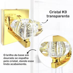 Descrição: - Materiais: metal e cristal k9. - Dimensões do cristal CxLxA : 7 cm x 7 cm x 4 cm - Dimensões da base: Altura: 12 cm Largura: 10 cm Profundidade: 2 cm - Profundidade total da arandela: 10 cm