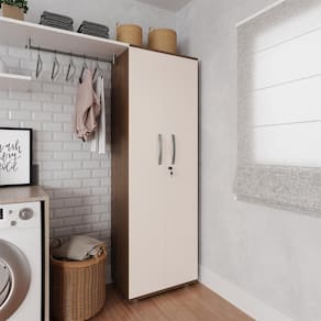 Com estrutura em MDP, possui duas portas com dobradiças metálicas, fechadura e cinco prateleiras internas que otimizam o espaço.