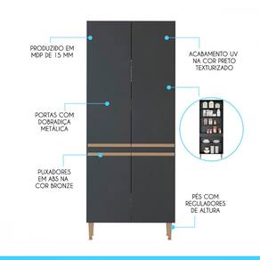 Características Técnicas: Produzida em MDP de 15 mm com acabamento UV na cor Preto Texturizado. Portas com dobradiças metálicas, puxadores perfil em PVC e pés reguláveis em ABS, ambos na cor bronze