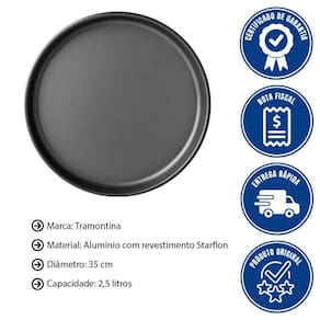 DESCRIÇÃO DA ASSADEIRA PARA PIZZA - Pode chamar os amigos e colocar a mão na massa! - Com a assadeira para pizza Tramontina Brasil em alumínio com revestimento interno e externo antiaderente Starflon Max grafite 35 centímetros de diâmetro 2,5 litros as reuniões entre amigos serão regadas de muita pizza. - Perfeita para assar e servir suas melhores receitas, ela é produzida em alumínio com revestimento interno e externo em antiaderente Starflon Max, permitindo que a pizza asse de maneira rápida e uniforme; além disso, possui maior durabilidade, não deixa os alimentos grudarem e não é prejudicial à saúde. - É superfácil de limpar e pode ir à máquina de lavar louças, tornando a limpeza muito mais fácil. - Garanta mais sabor e praticidade em sua cozinha!