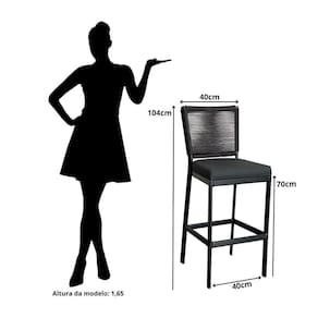 Estrutura em Alumínio, pintura Epóxi eletrostática, encosto revestido em corda sintética de altíssima qualidade ( COEX ), assento com espuma D-28, Tecido Acquablock impermeável,(PRETO) Karsten, proporcionando versatilidade e liberdade para ser usada em área gourmet, área de lazer, cozinhas, bancadas, bistrôs, padarias, cafés, lanchonetes, restaurantes, hotéis, etc.
