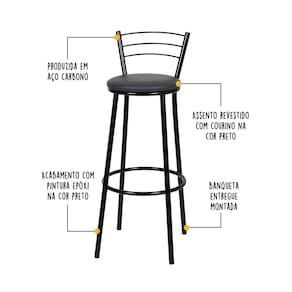 A Banqueta Mila é a escolha ideal para quem busca unir praticidade e conforto. Seu design atual com estrutura em aço oferece alta resistência e durabilidade, garantindo estabilidade mesmo com o uso diário. O assento estofado proporciona conforto extra, ideal para bancadas, balcões e áreas gourmet. Além de funcional, a banqueta é versátil e se adapta facilmente a diferentes ambientes, valorizando seu espaço. CARACTERÍSTICAS TÉCNICAS: - Produzido em Aço Carbono - Acabamento em Pintura Epóxi na cor Preto - Assento Revestido com Courino na cor Preto - Uso Exclusivo para Áreas Internas - Peso Máximo Suportado de até 80kg - Banqueta Entregue Montada *Kit Composto por DUAS Banquetas INFORMAÇÕES TÉCNICAS: Altura Total: 90 cm Altura Até o Assento: 69 cm Largura Total: 34 cm Profundidade Total: 34 cm Peso: 3 kg INFORMAÇÕES ADICIONAIS: - ATENÇÃO: Não trabalhamos e não nos responsabilizamos pela montagem do móvel. Antes da montagem conferir se o produto está de acordo com o que comprou, produto montado e danificado pela montagem não será aceito troca. Montagem e instalação por conta do comprador. - As imagens ambientadas são meramente ilustrativas e podem apresentar itens que não compõe o produto. As cores do produto podem variar de acordo com o monitor, a iluminação do ambiente ou sua percepção visual. - Limpeza: Deve ser feita com pano macio e seco ou levemente umedecido com água e sabão neutro. Não devem ser utilizados abrasivos como palha de aço e objetos cortantes. Garantia para defeitos de fabricação conforme Código de Defesa do Consumidor.